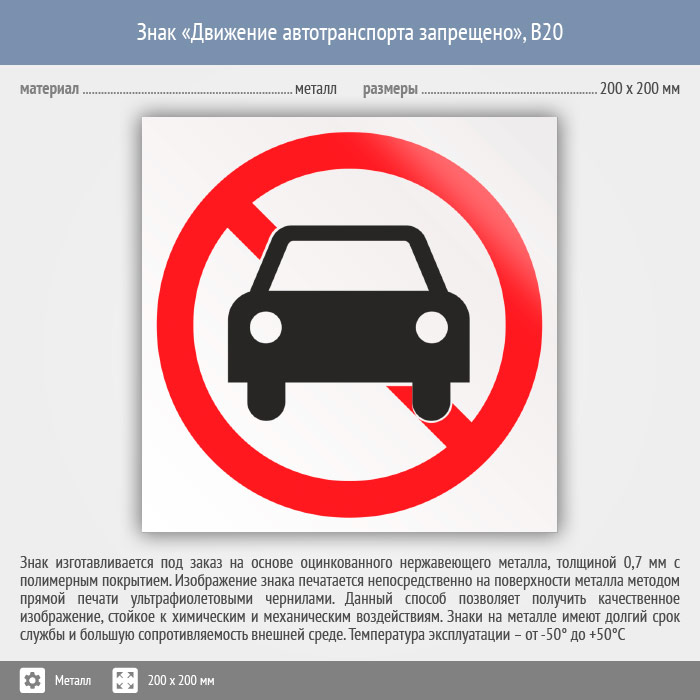 Знак «Движение автотранспорта запрещено», B20 на металле, размером 200х200 мм служит для обозначения мест, где движение на транспортных средствах запрещено. Вспомогательные знаки и таблички полностью соответствуют современным требованиям и стандартам. Таблички с поясняющими надписями используются в качестве самостоятельного знака, либо в качестве дополнения к основному знаку безопасности