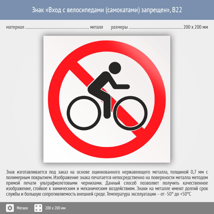 Знак «Вход с велосипедами (самокатами) запрещен», B22 на металле, размером 200х200 мм служит для обозначения мест, где вход с велосипедами или самокатами запрещен. Вспомогательные знаки и таблички полностью соответствуют современным требованиям и стандартам. Таблички с поясняющими надписями используются в качестве самостоятельного знака, либо в качестве дополнения к основному знаку безопасности