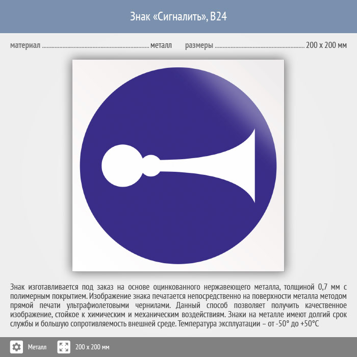 Знак «Сигналить», B24 на металле, размером 200х200 мм предупреждает о том, что если подъехал, то надо посигналить. Вспомогательные знаки и таблички полностью соответствуют современным требованиям и стандартам. Таблички с поясняющими надписями используются в качестве самостоятельного знака, либо в качестве дополнения к основному знаку безопасности
