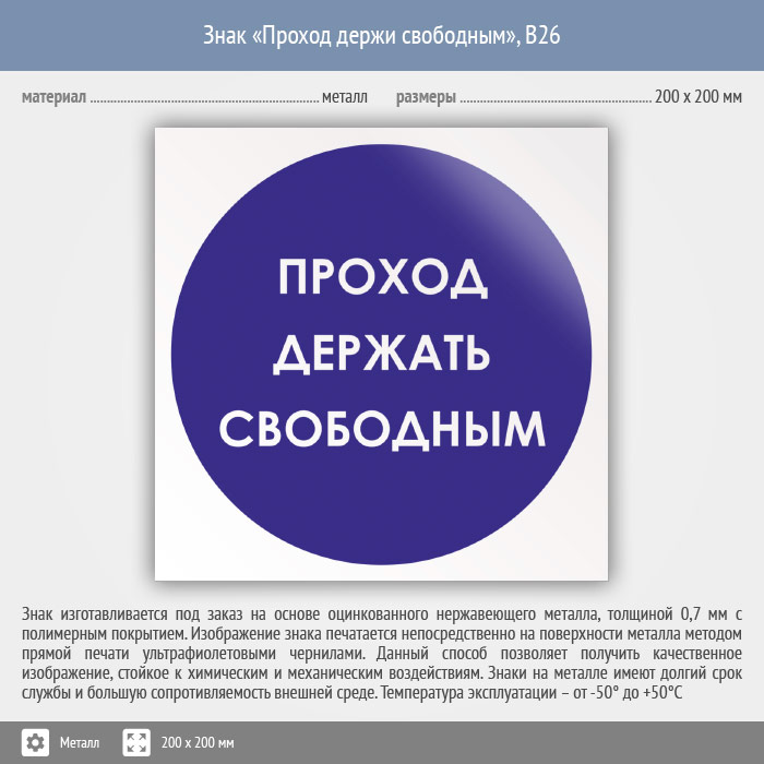 Знак «Проход держи свободным», B26 на металле, размером 200х200 мм напоминает о важности свободного прохода. Вспомогательные знаки и таблички полностью соответствуют современным требованиям и стандартам. Таблички с поясняющими надписями используются в качестве самостоятельного знака, либо в качестве дополнения к основному знаку безопасности