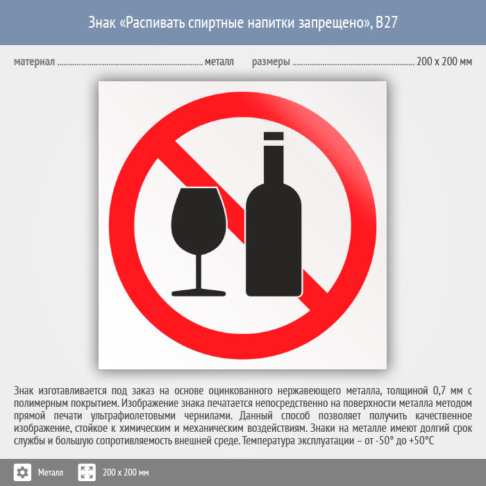 Знак «Распивать спиртные напитки запрещено», B27 на металле, размером 200х200 мм напомнит, что в данном месте распивать спиртные напитки запрещено. Вспомогательные знаки и таблички полностью соответствуют современным требованиям и стандартам. Таблички с поясняющими надписями используются в качестве самостоятельного знака, либо в качестве дополнения к основному знаку безопасности