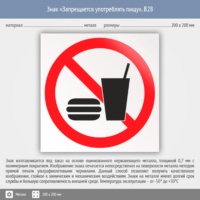 Знак «Запрещается употреблять пищу», B28 на металле, размером 200х200 мм подскажет, что в этом месте запрещено употреблять пищу. Вспомогательные знаки и таблички полностью соответствуют современным требованиям и стандартам. Таблички с поясняющими надписями используются в качестве самостоятельного знака, либо в качестве дополнения к основному знаку безопасности