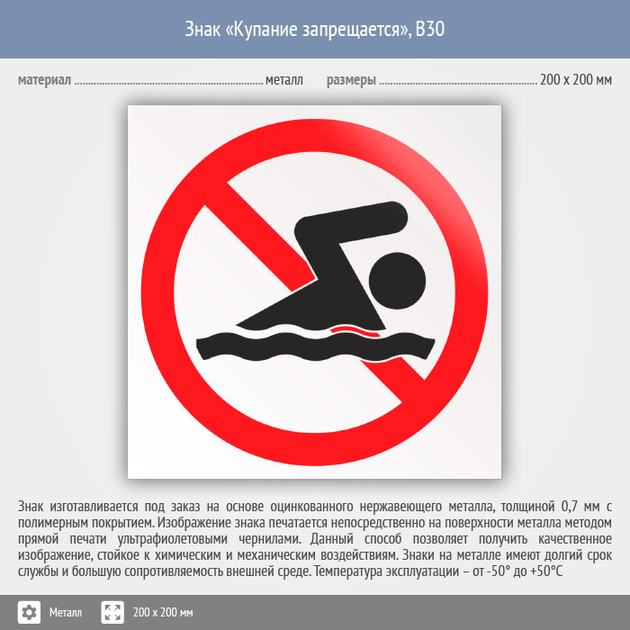 Знак «Купание запрещено», B30 на металле, размером 200х200 мм подскажет или напомнит, что здесь купаться запрещено. Вспомогательные знаки и таблички полностью соответствуют современным требованиям и стандартам. Таблички с поясняющими надписями используются в качестве самостоятельного знака, либо в качестве дополнения к основному знаку безопасности