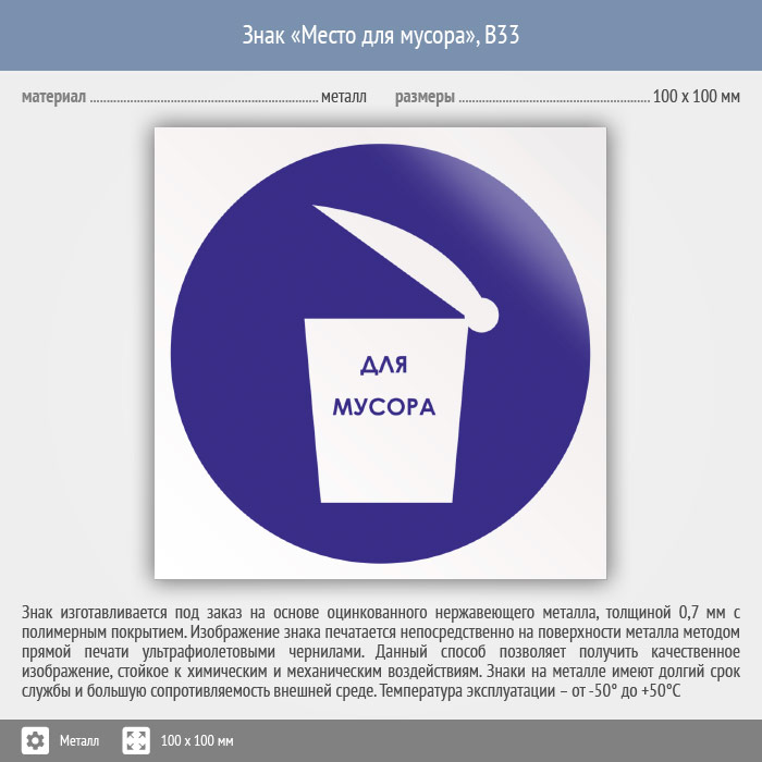 Знак «Место для мусора», B33 на металле, размером 100х100 мм обозначает место, куда надо выбрасывать мусор. Вспомогательные знаки и таблички полностью соответствуют современным требованиям и стандартам. Таблички с поясняющими надписями используются в качестве самостоятельного знака, либо в качестве дополнения к основному знаку безопасности