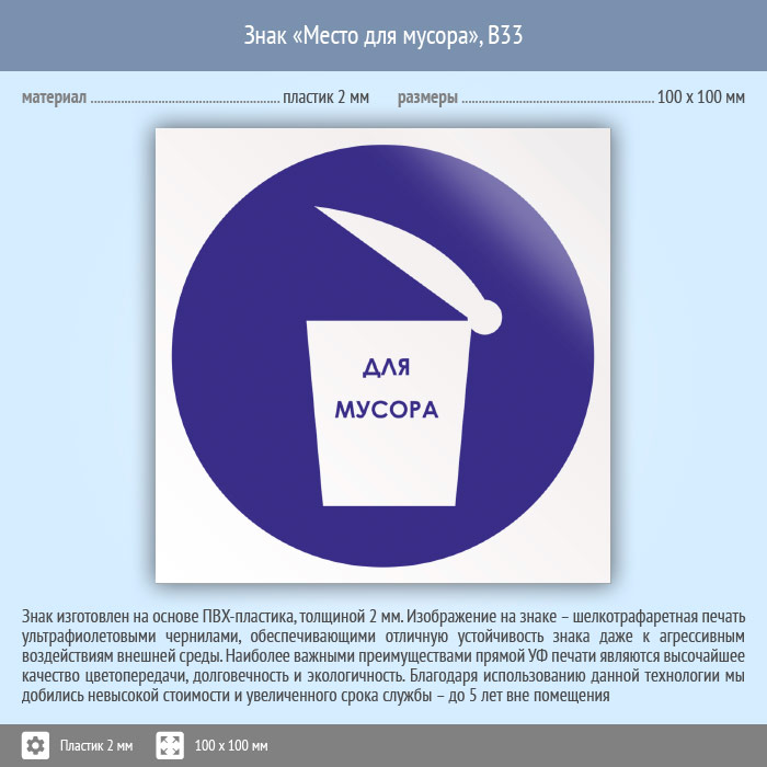 Знак «Место для мусора», B33 на пластике, размером 100х100 мм обозначает место, куда надо выбрасывать мусор. Вспомогательные знаки и таблички полностью соответствуют современным требованиям и стандартам. Таблички с поясняющими надписями используются в качестве самостоятельного знака, либо в качестве дополнения к основному знаку безопасности