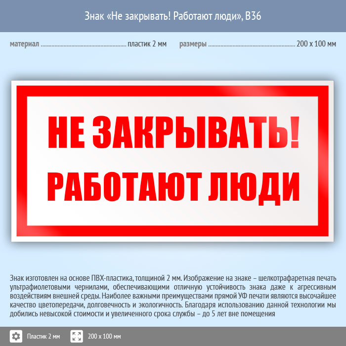 Знак «Не закрывать! Работают люди», B36 на пластике, размером 200х100 мм предупреждает о том, что идет работа и закрывать или перекрывать запрещено. Вспомогательные знаки и таблички полностью соответствуют современным требованиям и стандартам. Таблички с поясняющими надписями используются в качестве самостоятельного знака, либо в качестве дополнения к основному знаку безопасности