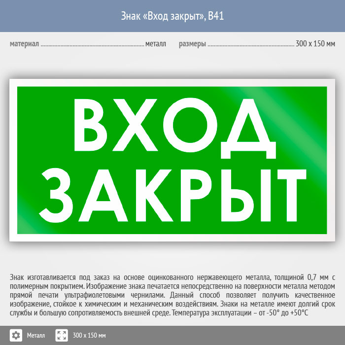 Знак «Вход закрыт», B41 на металле, размером 300х150 мм предупреждает о том, что вход закрыт или временно перекрыт. Вспомогательные знаки и таблички полностью соответствуют современным требованиям и стандартам. Таблички с поясняющими надписями используются в качестве самостоятельного знака, либо в качестве дополнения к основному знаку безопасности