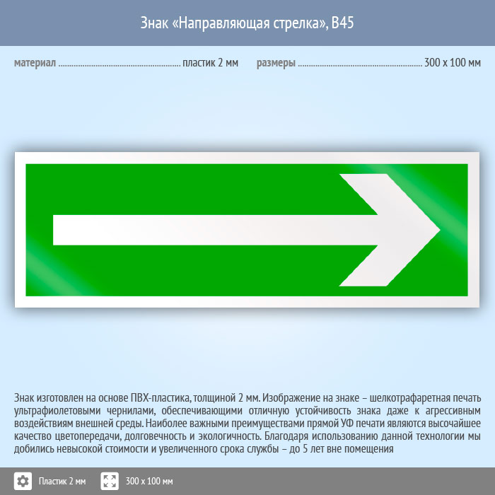 Знак «Направляющая стрелка», B45 на пластике, размером 300х100 мм обозначает направление движения или эвакуации. Вспомогательные знаки и таблички полностью соответствуют современным требованиям и стандартам. Таблички с поясняющими надписями используются в качестве самостоятельного знака, либо в качестве дополнения к основному знаку безопасности