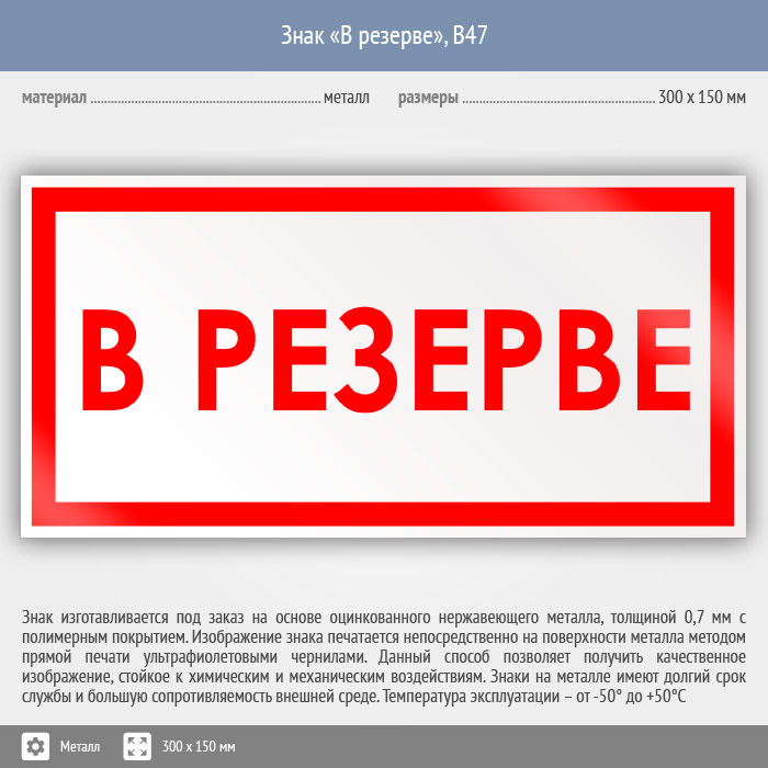 Знак «В резерве», B47 на металле, размером 300х150 мм служит для обозначения, что данный предмет находится в резерве. Вспомогательные знаки и таблички полностью соответствуют современным требованиям и стандартам. Таблички с поясняющими надписями используются в качестве самостоятельного знака, либо в качестве дополнения к основному знаку безопасности