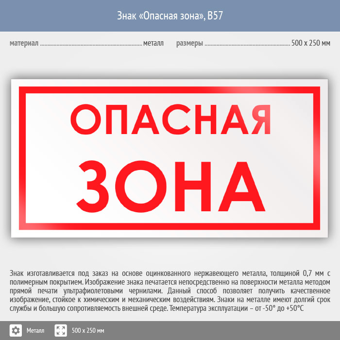 Знак «Опасная зона», B57 на металле, размером 500х250 мм предупреждает о близости расположения опасного места. Вспомогательные знаки и таблички полностью соответствуют современным требованиям и стандартам. Таблички с поясняющими надписями используются в качестве самостоятельного знака, либо в качестве дополнения к основному знаку безопасности