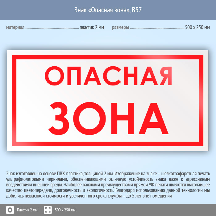 Знак «Опасная зона», B57 на пластике, размером 500х250 мм предупреждает о близости расположения опасного места. Вспомогательные знаки и таблички полностью соответствуют современным требованиям и стандартам. Таблички с поясняющими надписями используются в качестве самостоятельного знака, либо в качестве дополнения к основному знаку безопасности