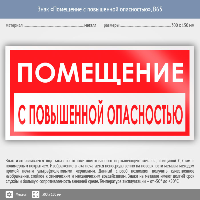 Знак «Помещение с повышенной опасностью», B65 на металле, размером 300х150 мм предупреждает об осторожности. Вспомогательные знаки и таблички полностью соответствуют современным требованиям и стандартам. Таблички с поясняющими надписями используются в качестве самостоятельного знака, либо в качестве дополнения к основному знаку безопасности