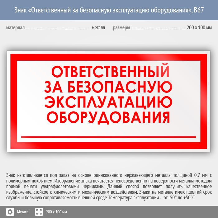 Знак «Ответственный за безопасную эксплуатацию оборудования», B67 на металле, размером 200х100 мм информирует об ответственном за безопасность при эксплуатации оборудования. Вспомогательные знаки и таблички полностью соответствуют современным требованиям и стандартам. Таблички с поясняющими надписями используются в качестве самостоятельного знака, либо в качестве дополнения к основному знаку безопасности