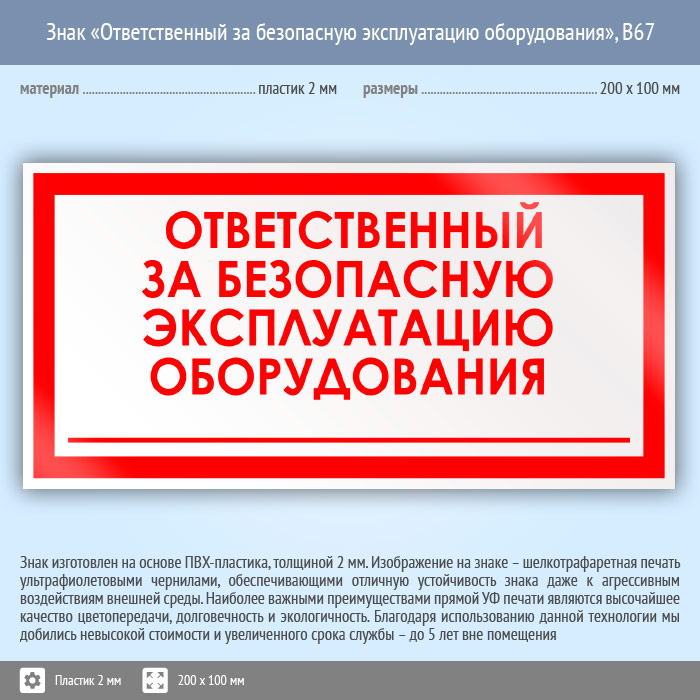 Знак «Ответственный за безопасную эксплуатацию оборудования», B67 на пластике, размером 200х100 мм информирует об ответственном за безопасность при эксплуатации оборудования. Вспомогательные знаки и таблички полностью соответствуют современным требованиям и стандартам. Таблички с поясняющими надписями используются в качестве самостоятельного знака, либо в качестве дополнения к основному знаку безопасности