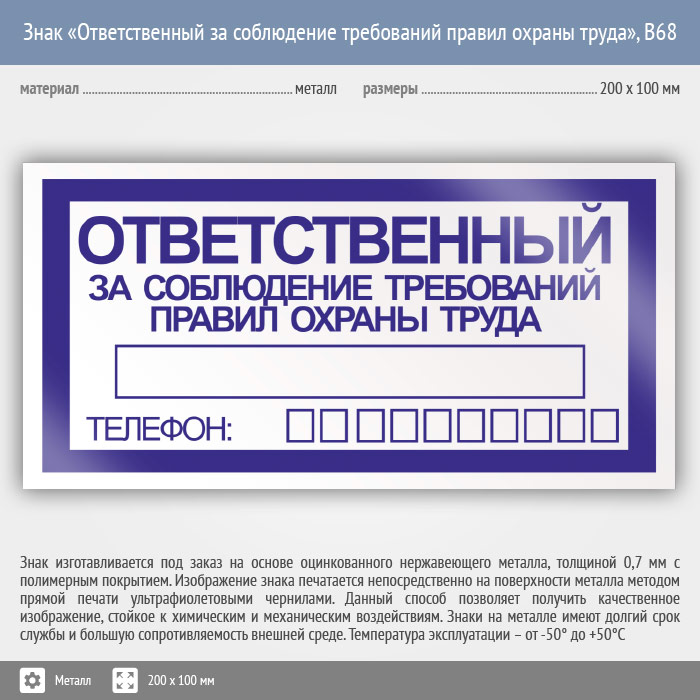 Знак «Ответственный за соблюдение требований правил охраны труда», B68 на металле, размером 200х100 мм информирует об ответственном за соблюдение требований правил охраны труда. Вспомогательные знаки и таблички полностью соответствуют современным требованиям и стандартам. Таблички с поясняющими надписями используются в качестве самостоятельного знака, либо в качестве дополнения к основному знаку безопасности