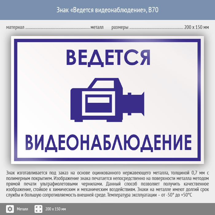 Знак «Ведется видеонаблюдение», B70 на металле, размером 200х150 мм информирует о том, что в помещении производится видеоконтроль. Вспомогательные знаки и таблички полностью соответствуют современным требованиям и стандартам. Таблички с поясняющими надписями используются в качестве самостоятельного знака, либо в качестве дополнения к основному знаку безопасности