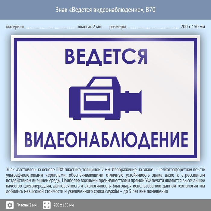 Знак «Ведется видеонаблюдение», B70 на пластике, размером 200х150 мм информирует о том, что в помещении производится видеоконтроль. Вспомогательные знаки и таблички полностью соответствуют современным требованиям и стандартам. Таблички с поясняющими надписями используются в качестве самостоятельного знака, либо в качестве дополнения к основному знаку безопасности