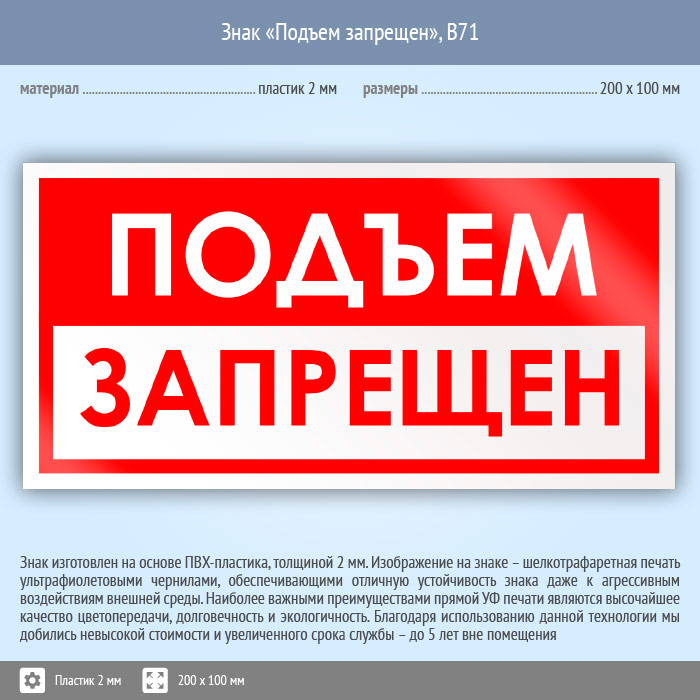 Знак «Подъем запрещен», B71 на пластике, размером 200х100 мм предупреждает о том, что в данном месте запрещен подъем. Вспомогательные знаки и таблички полностью соответствуют современным требованиям и стандартам. Таблички с поясняющими надписями используются в качестве самостоятельного знака, либо в качестве дополнения к основному знаку безопасности