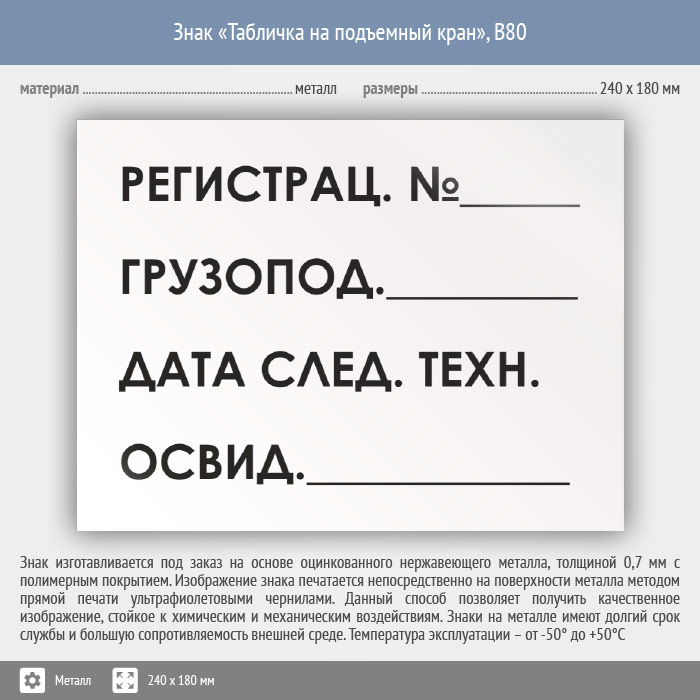 Знак «Табличка на подъемный кран», B80 на металле, размером 240х180 мм вывешивается на подъемных кранах с целью извещения о работе крана. Вспомогательные знаки и таблички полностью соответствуют современным требованиям и стандартам. Таблички с поясняющими надписями используются в качестве самостоятельного знака, либо в качестве дополнения к основному знаку безопасности