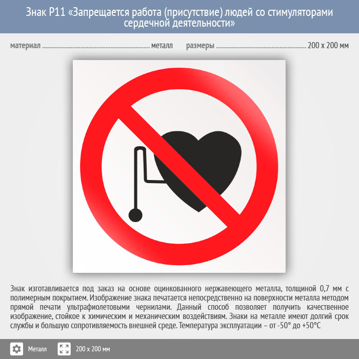 Знак P11 «Запрещается работа (присутствие) людей со стимуляторами сердечной деятельности» на металле, размером 200х200 мм предупреждает людей с кардиостимуляторами о том, что их нахождение в зоне опасно для жизни. Запрещающие знаки полностью соответствуют требованиям ГОСТ Р 12.4.026-2015 и предназначены для запрещения опасного поведения или действия