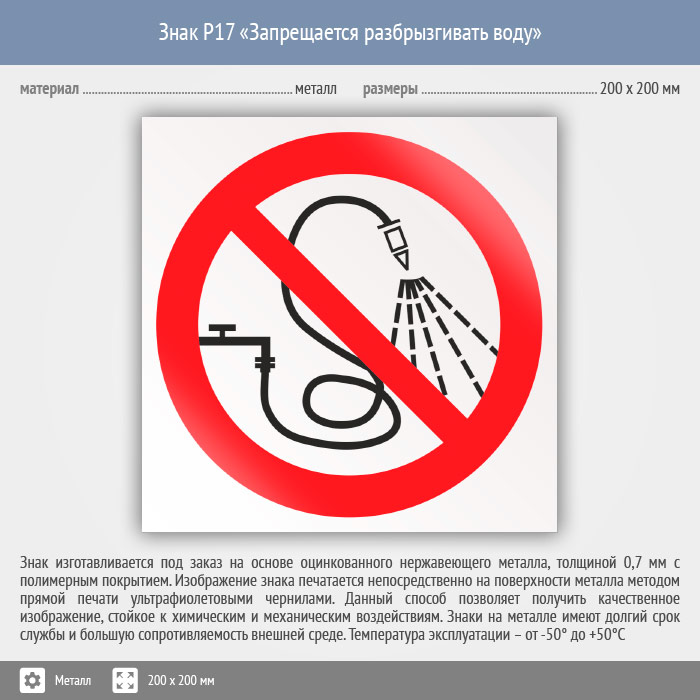 Знак P17 «Запрещается разбрызгивать воду» на металле, размером 200х200 мм указывает на то, что с водой надо обращаться бережно, а зачастую и небезопасно брызгаться и плескаться. Запрещающие знаки полностью соответствуют требованиям ГОСТ Р 12.4.026-2015 и предназначены для запрещения опасного поведения или действия