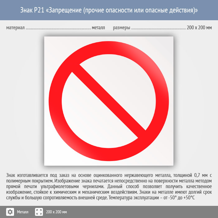 Знак P21 «запрещение (прочие опасности или опасные действия)» на металле, размером 200х200 мм запрещает все или разрешает ничего – обычно идет с поясняющей надписью. Запрещающие знаки полностью соответствуют требованиям ГОСТ Р 12.4.026-2015 и предназначены для запрещения опасного поведения или действия