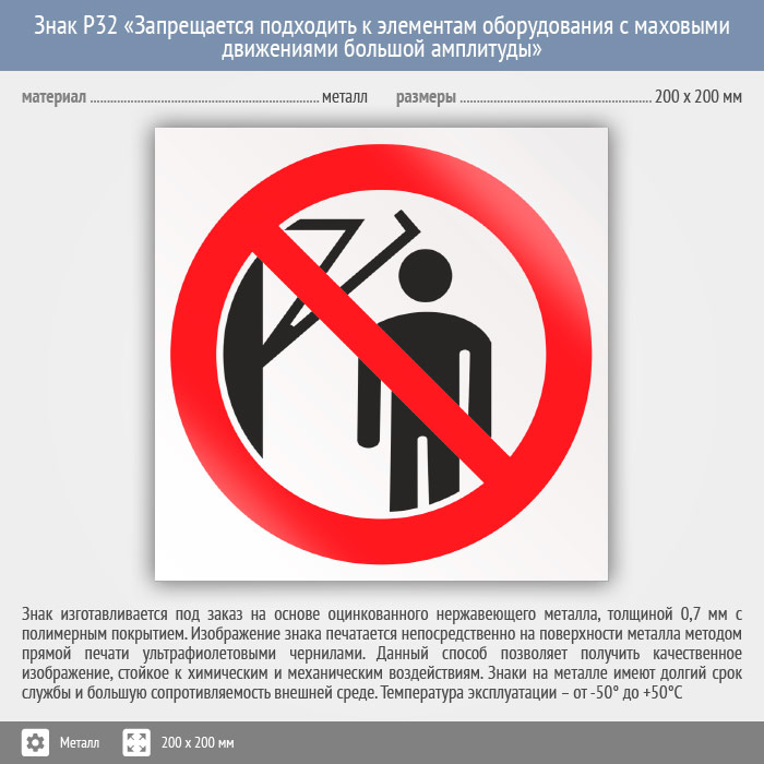 Знак P32 «Запрещается подходить к элементам оборудования с маховыми движениями большой амплитуды» (металл, 200х200 мм)