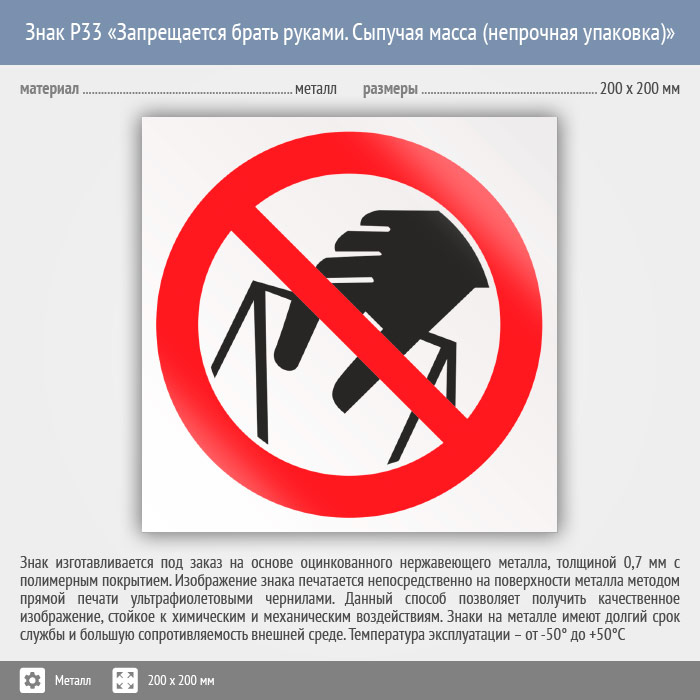 Знак P33 «Запрещается брать руками. Сыпучая масса (непрочная упаковка)» (металл, 200х200 мм)