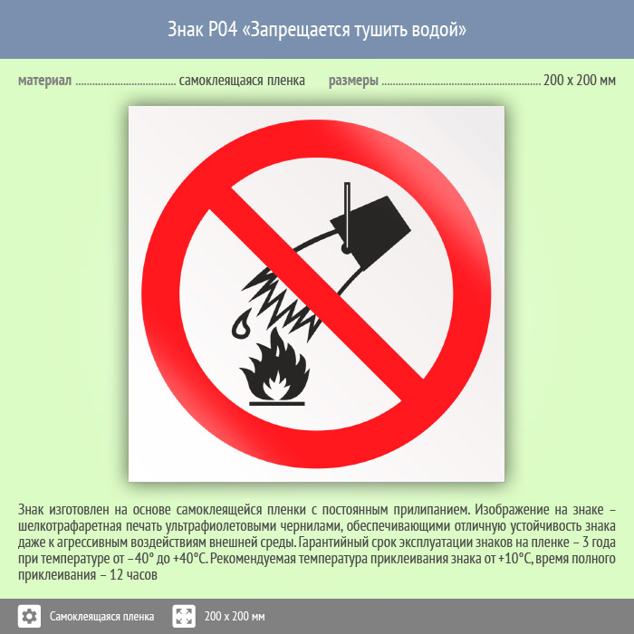Знак P04 «Запрещается тушить водой» (пленка, 200х200 мм)