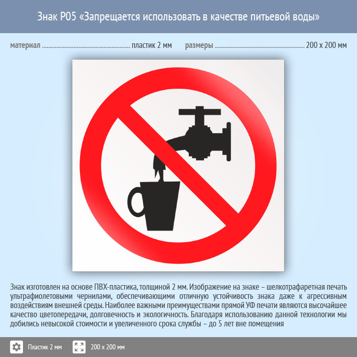 Знак P05 «Запрещается использовать в качестве питьевой воды» на пластике, размером 200х200 мм указывает на то, что пить эту крайне небезопасно для жизни и здоровья. Запрещающие знаки полностью соответствуют требованиям ГОСТ Р 12.4.026-2015 и предназначены для запрещения опасного поведения или действия
