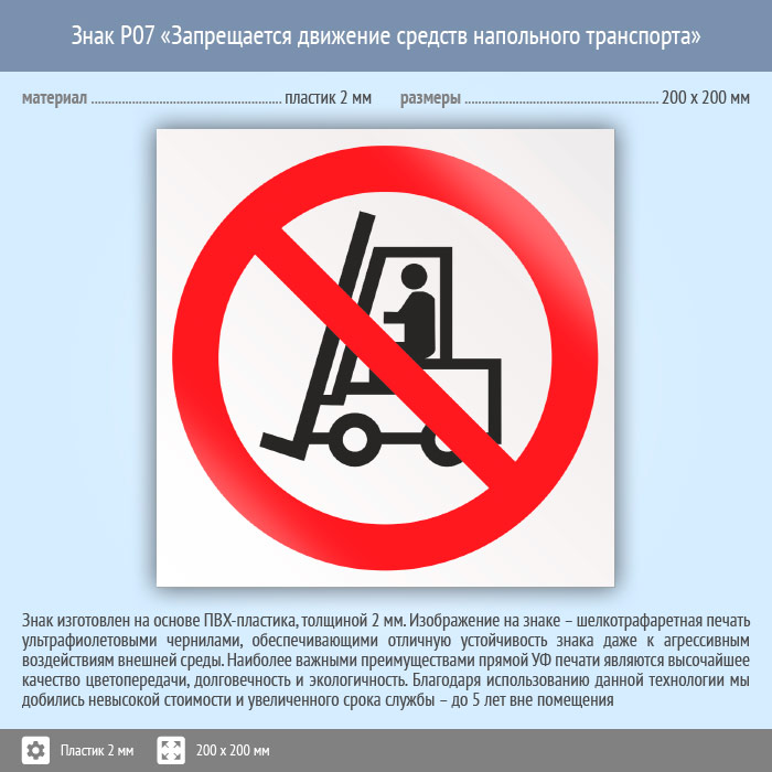 Знак P07 «Запрещается движение средств напольного транспорта» на пластике, размером 200х200 мм указывает на то, что в данном месте использование автопогрузчиков и других напольных транспортных средств запрещено. Запрещающие знаки полностью соответствуют требованиям ГОСТ Р 12.4.026-2015 и предназначены для запрещения опасного поведения или действия