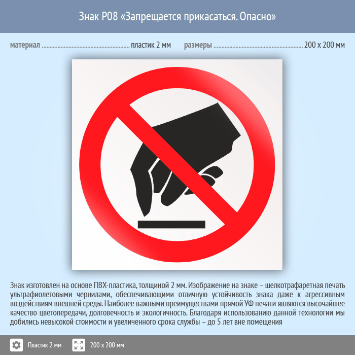 Знак P08 «Запрещается прикасаться. Опасно» на пластике, размером 200х200 мм предупреждает о наличии опасности в данном месте или устройстве. Запрещающие знаки полностью соответствуют требованиям ГОСТ Р 12.4.026-2015 и предназначены для запрещения опасного поведения или действия
