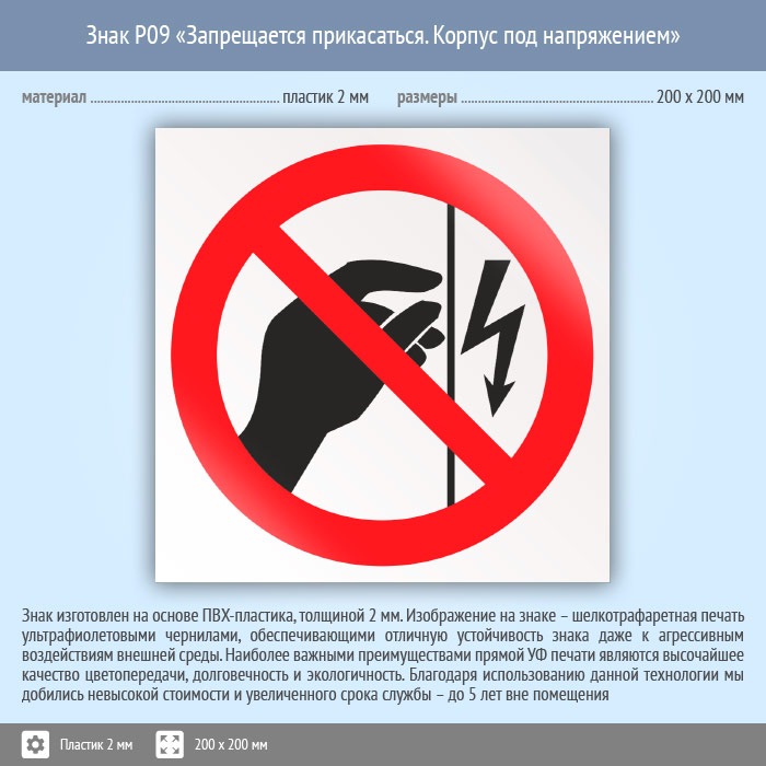 Знак P09 «Запрещается прикасаться. Корпус под напряжением» на пластике, размером 200х200 мм запрещает прикасаться к данной установке или устройству, находящемуся под электрическим напряжением. Запрещающие знаки полностью соответствуют требованиям ГОСТ Р 12.4.026-2015 и предназначены для запрещения опасного поведения или действия
