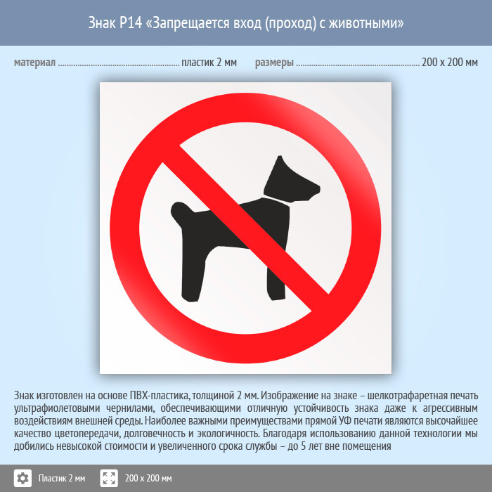 Знак P14 «Запрещается вход (проход) с животными» на пластике, размером 200х200 мм сообщает, что животным здесь не место. Запрещающие знаки полностью соответствуют требованиям ГОСТ Р 12.4.026-2015 и предназначены для запрещения опасного поведения или действия