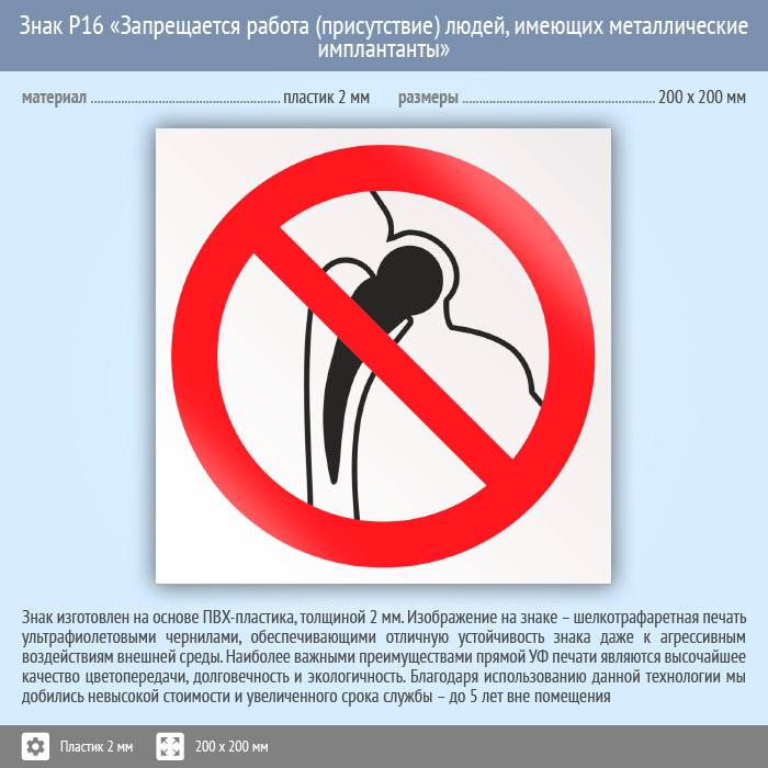 Знак P16 «Запрещается работа (присутствие) людей, имеющих металлические имплантанты» на пластике, размером 200х200 мм обычно размещается в помещениях, где действуют электромагнитные волны, применение которых крайне небезопасно для людей с металлическими деталями. Запрещающие знаки полностью соответствуют требованиям ГОСТ Р 12.4.026-2015 и предназначены для запрещения опасного поведения или действия