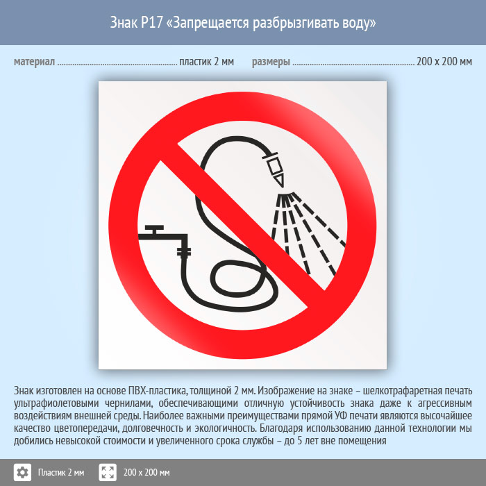 Знак P17 «Запрещается разбрызгивать воду» на пластике, размером 200х200 мм указывает на то, что с водой надо обращаться бережно, а зачастую и небезопасно брызгаться и плескаться. Запрещающие знаки полностью соответствуют требованиям ГОСТ Р 12.4.026-2015 и предназначены для запрещения опасного поведения или действия
