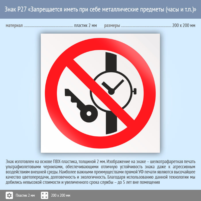 Знак P27 «Запрещается иметь при (на) себе металлические предметы (часы и т.п.)» на пластике, размером 200х200 мм напоминает, что нахождение металлических предметов в данном месте небезопасно. Запрещающие знаки полностью соответствуют требованиям ГОСТ Р 12.4.026-2015 и предназначены для запрещения опасного поведения или действия