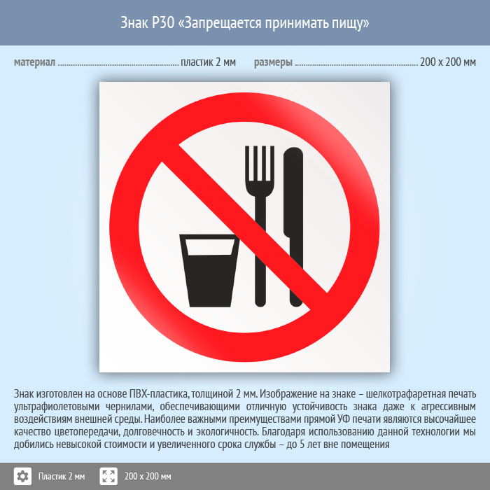 Знак P30 «Запрещается принимать пищу» (пластик, 200х200 мм)