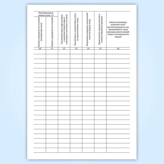 Учет продуктов, заложенных в котлы, фактического выхода готовых блюд, мясных и рыбных порций и качества приготовленной в столовой пищи (на камбузе корабля, ведущего свое хозяйство) ведется в книге учета контроля за качеством приготовления пищи.
