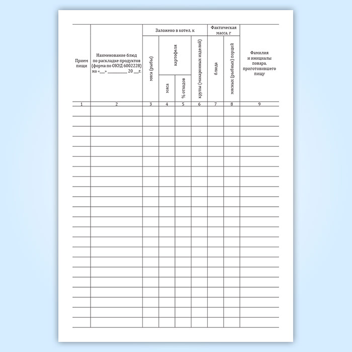 2. Наименование блюд по раскладке продуктов (форма по ОКУД 6002228) на «___» ____________ 20 ___г.