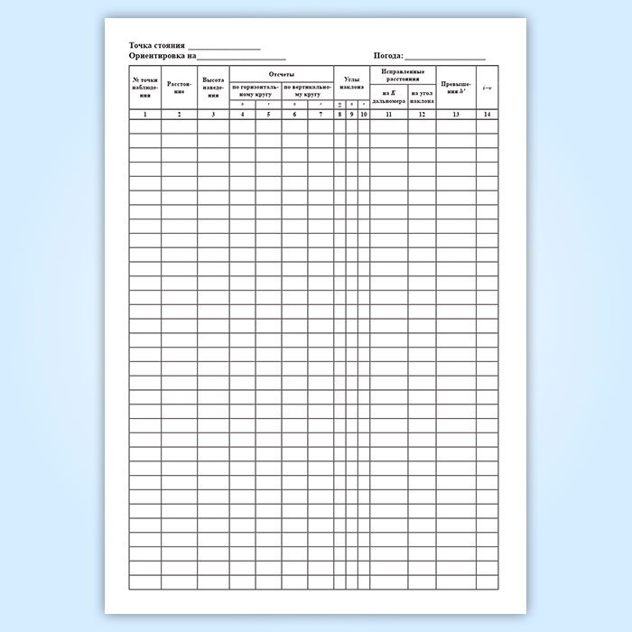 Журнал тахеометрической съемки (Форма УТ-29) имеет графы (столбцы):