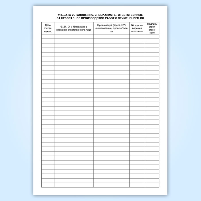 VIII. Дата установки ПС. Специалисты, ответственные за безопасное производство работ с применением ПС