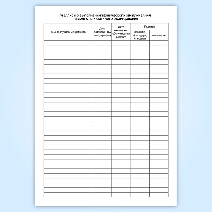 VI. Записи о выполнении технического обслуживания, ремонта машины и сменного оборудования
