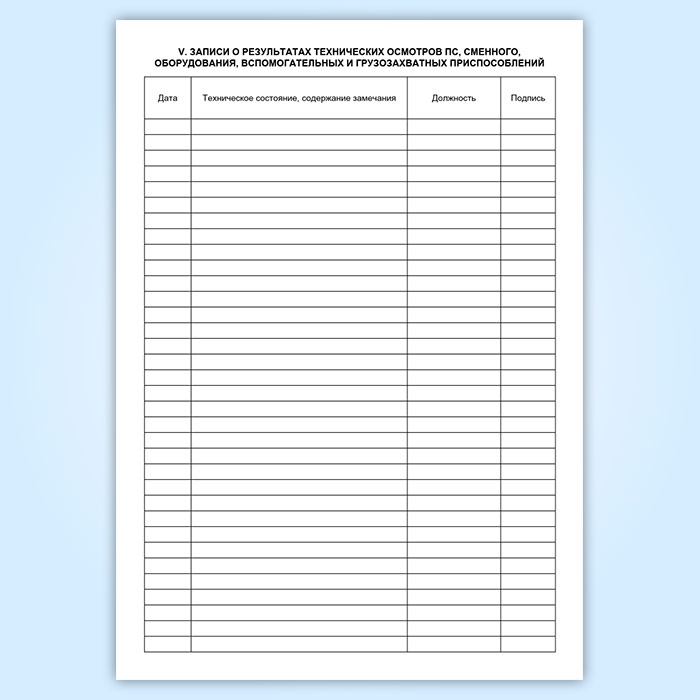 V. Записи о результатах технических осмотров ПС, сменного оборудования, вспомогательных и грузозахватных приспособлений