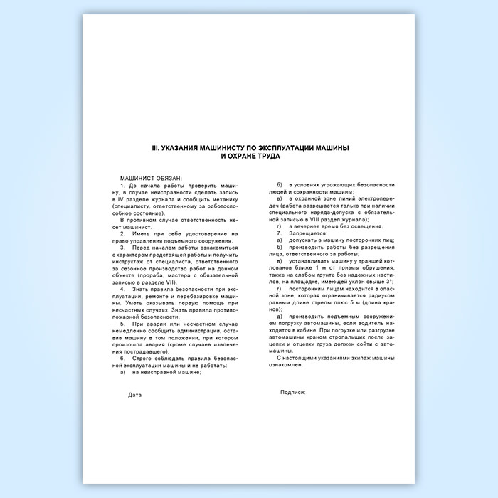 III. Указания машинисту по эксплуатации машины и безопасности. Краткие инструкции