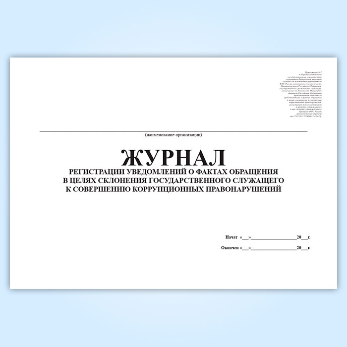 Форма журнала соответствует Приложение N 2 к Приказу ФНС РФ от 15.03.2011 N ММВ-7-4/202@ "О порядке уведомления государственными гражданскими служащими Федеральной налоговой службы представителя нанимателя (работодателя) о фактах обращения в целях склонения их к совершению коррупционных правонарушений, регистрации таких уведомлений и проверки содержащихся в них сведений"