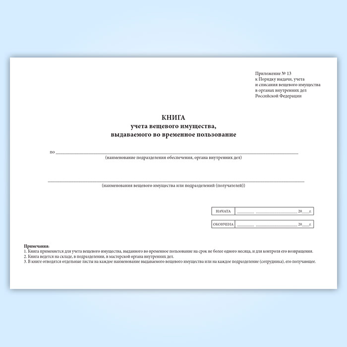 Форма книги учета вещевого имущества, выдаваемого во временное пользование соответствует Приложению 13 к Порядку выдачи, учета и списания вещевого имущества в органах внутренних дел Российской Федерации.