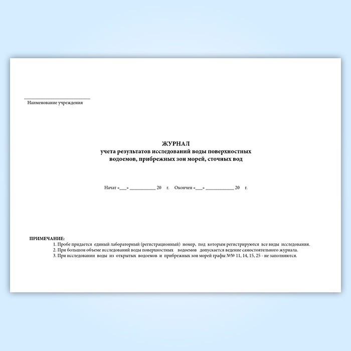 Форма журнала учета результатов исследований воды поверхностных водоемов, прибрежных зон морей, сточных вод (324-у) утверждена приказом Минздрава СССР №1030 «Об утверждении форм первичной медицинской документации учреждений здравоохранения».