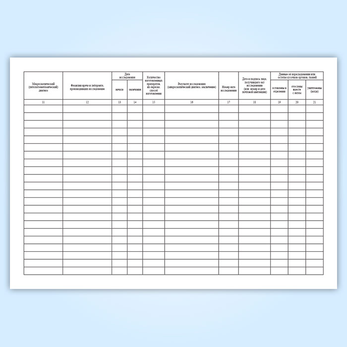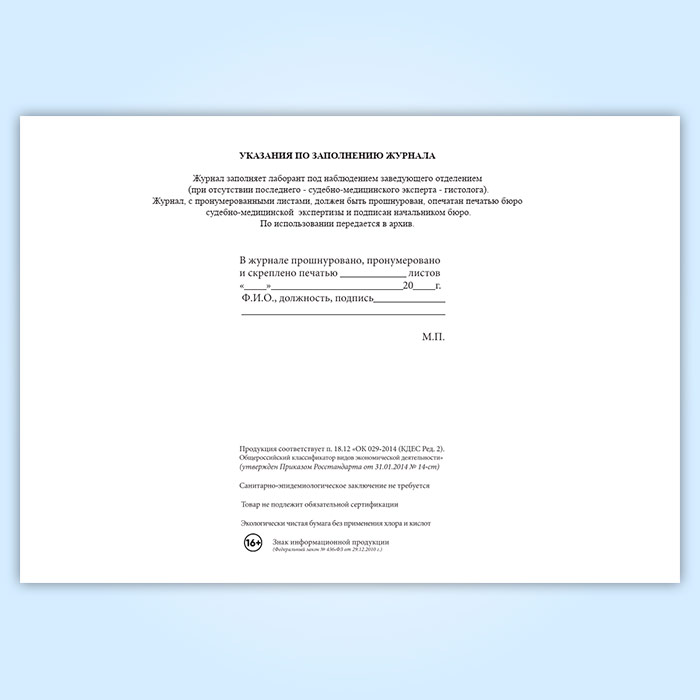 Записи в журнале ведет лаборант под наблюдением заведующего отделением (при отсутствии последнего - судебно-медицинского эксперта - гистолога). Журнал, с пронумерованными листами, должен быть прошнурован, опечатан печатью бюро судебно-медицинской экспертизы и подписан начальником бюро. По использовании передается в архив.