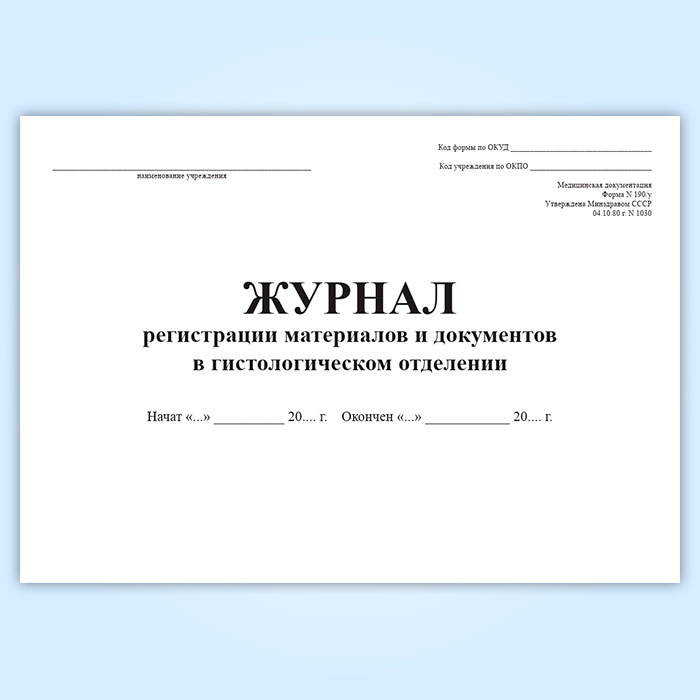Журнал регистрации материалов и документов в гистологическом отделении (Форма 190/у) утвержден Приказом Министерства Здравоохранения СССР от 4 октября 1980 года № 1030 «Об утверждении форм первичной медицинской документации учреждений здравоохранения (с изменениями на 31 декабря 2002 года)